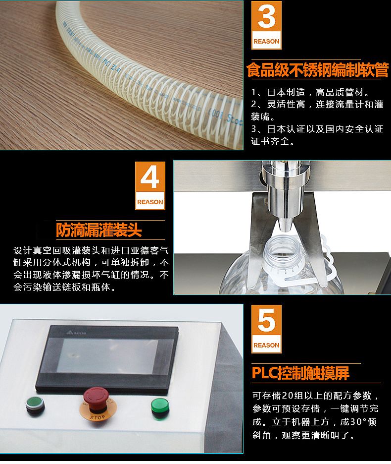 灌裝頭采用國家知識產權局認證的實用新型專利(專利證號:ZL201320358214.7)設計真空回吸灌裝頭和進口亞德客氣缸采用分體式機構,可單拆卸,不會出現液體滲漏損壞氣缸的情況。不會污染輸送鏈板和瓶體。